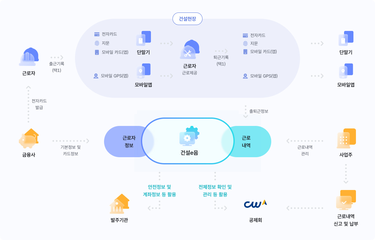 또한, 건설근로자 전자카드는 금융기관에서 발급하는 금융형 카드로 금융실명제법에 의한 카드 발급자의 정확한 근로자 개인정보 파악이 가능하고, 전자카드 보안성 및 활용성 제고도 가능합니다.