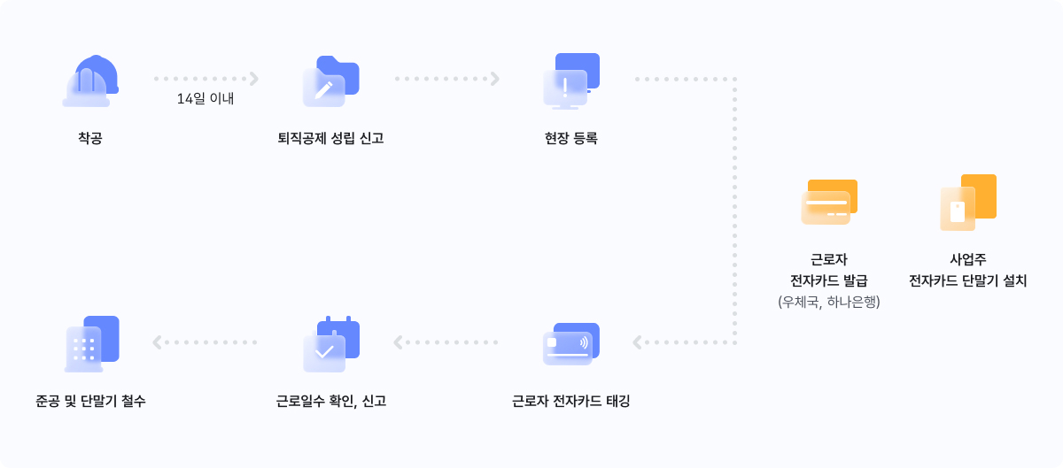이미지는 한국의 건설 현장 근로자 전자카드 시스템 도입 과정과 관련된 흐름도입니다. 아래는 각 단계의 설명입니다: 1. 착공 : 공사 시작 후 14일 이내. 2. 퇴직공제 성립 신고 3. 현장 등록 4. 근로자 전자카드 발급: 근로자는 우체국 또는 하나은행에서 전자카드를 발급받음. 5. 사업주 전자카드 단말기 설치: 사업주는 근로자의 전자카드를 인식할 단말기를 설치. 6. 근로자 전자카드 태깅 7. 근로일수 확인 및 신고 8. 준공 및 단말기 철수: 공사가 끝나면 단말기를 철수함. 이 흐름도는 전자카드 시스템을 통한 근로자의 출퇴근 관리와 퇴직 공제 성립 과정을 시각적으로 설명하고 있습니다.