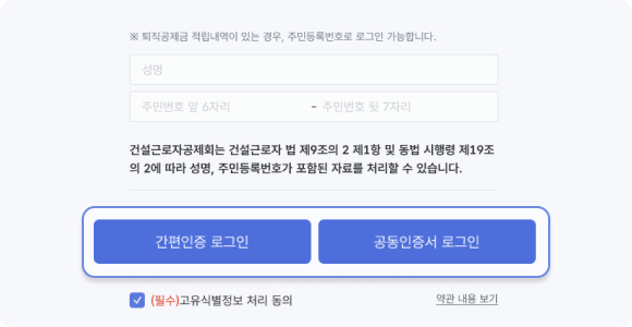 - 피공제자번호를 보유한 건설근로자는 본인인증을 통해 로그인하여 서비스이용이 가능합니다.